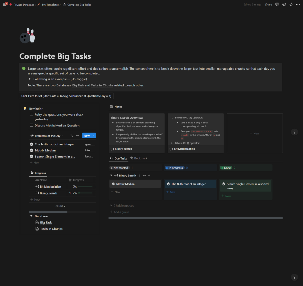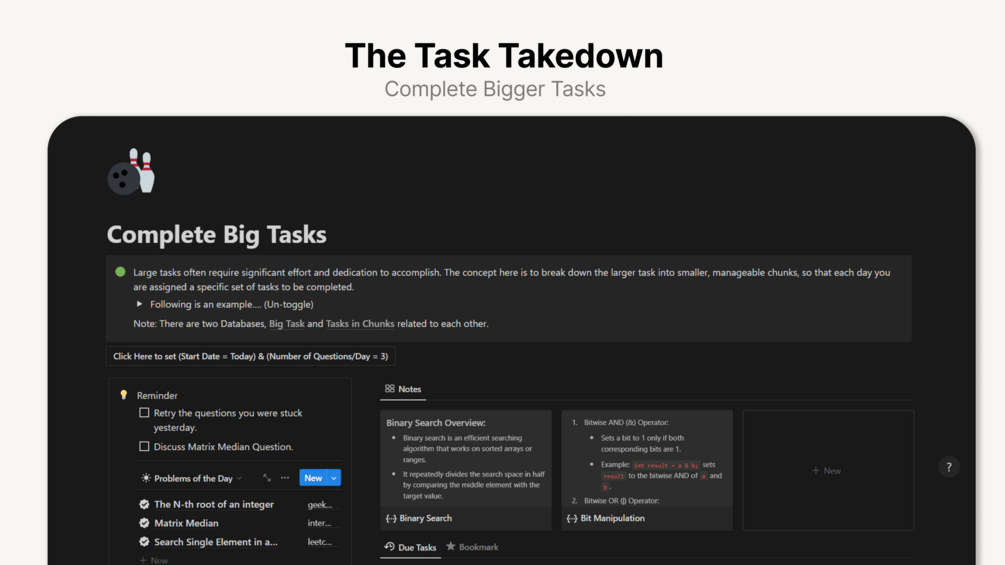 Conquer large tasks with ease using "The Task Takedown Notion Template: Breaking Down Large Tasks." This powerful template helps you break overwhelming projects into manageable chunks. It automates the delivery of tasks, provides a centralized hub, and ensures efficient learning. Say goodbye to stress and hello to productivity!
